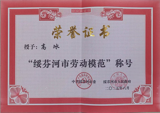 近日,中环水务下属绥芬河中环水务有限公司水库巡查负责人高冰同志被授予“2020-2024年度绥芬河市劳动模范”荣誉称号。